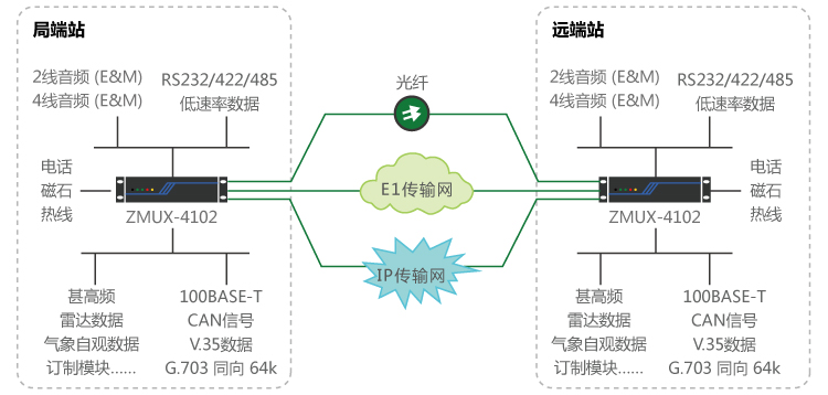 基于IP專線、光纖線路、E1 線路自動切換:遠端站到局端之間,租用運營商IP專線與E1線路、光纖線路,通過接入ZMUX-4102平臺,完成IP專線與E1線、光纖線路自動切換功能,保障甚高頻、雷達數據等業務的安全可靠性傳輸。